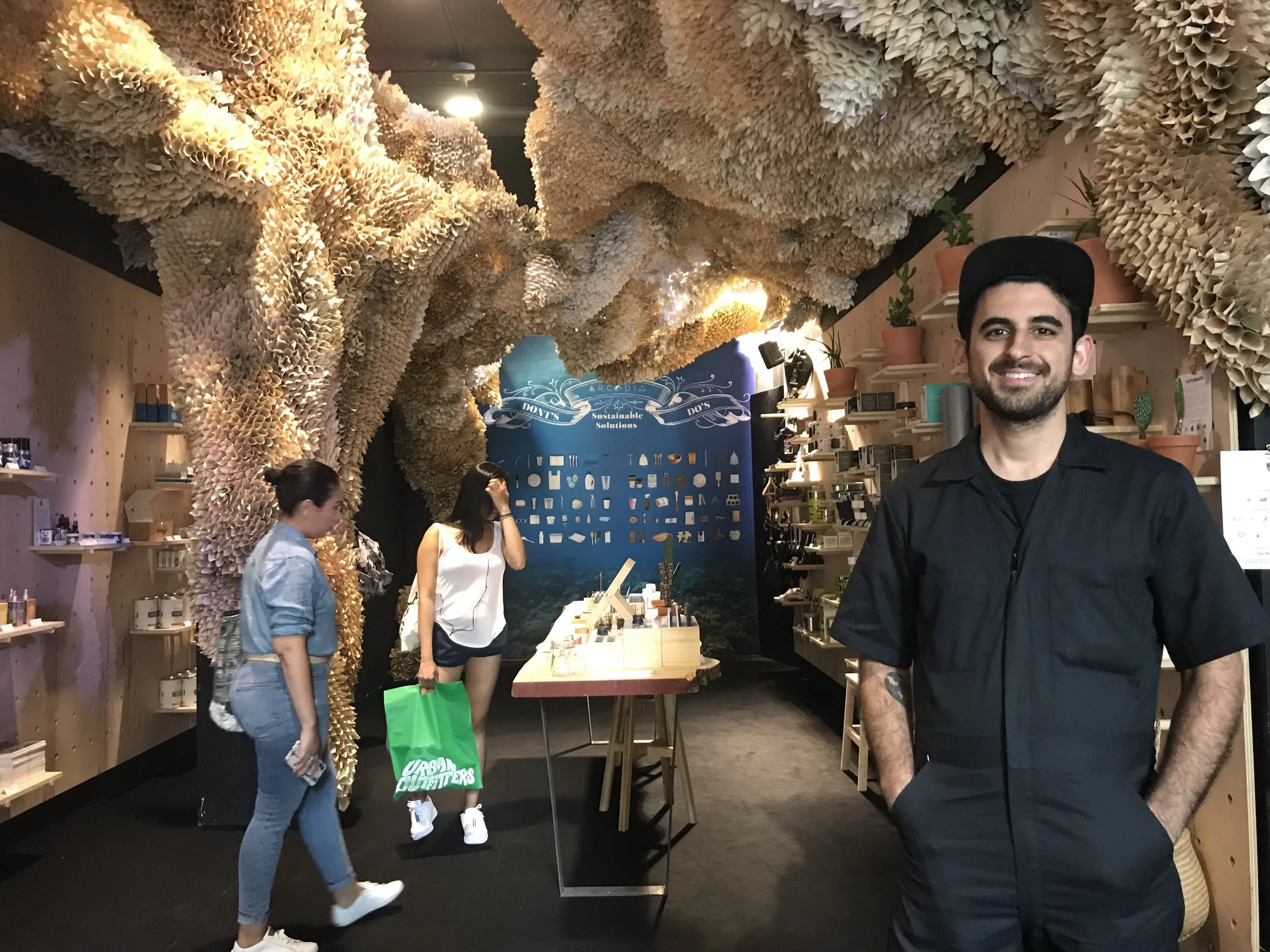 Holding down the fort in the retail shop, featuring repurposed book pages to create a coral reef effect.