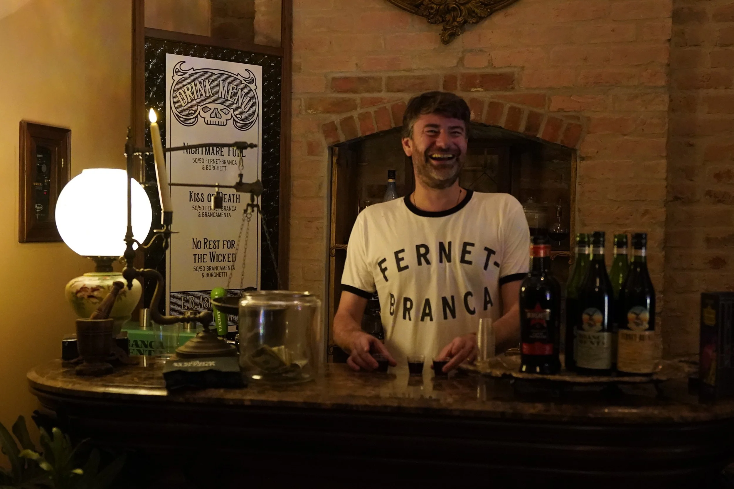 Edoardo Branca, pouring a few shots at the manor. He is a sixth-generation descendant of Bernandino Branca—who created the bitter herbal Italian liqueur Fernet-Branca.