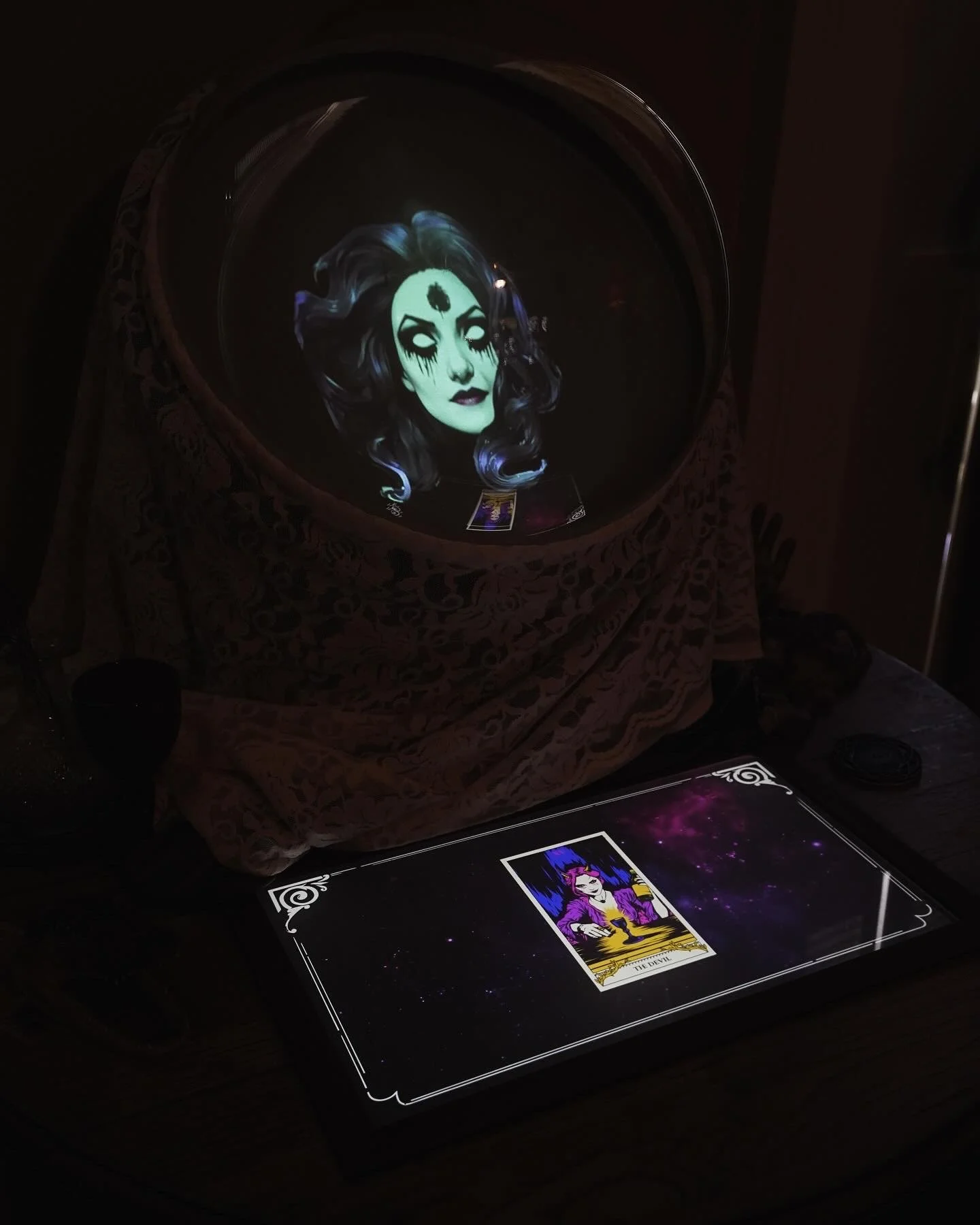Our peppers ghost AI generated tarot reader featuring cards designed by Diego Patiño.